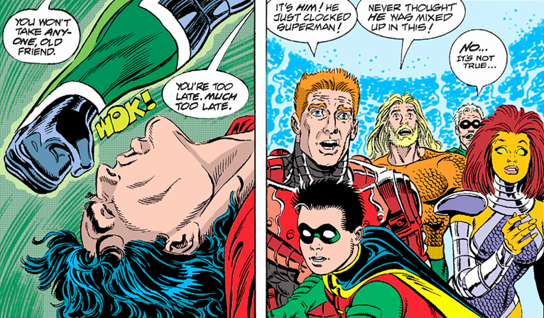 The new and improved Waverider’s sudden appearance is a great visual, but nothing compares to a couple pages later where we see who has the power to KO Superman. Designed by perhaps my favourite Green Lantern artist Darryl Banks, Parallax Hal Jordan’s costume has always been a favourite of mine (in spite of its ‘90s hallmarks like the giant shoulder armour), and it’s never looked better than here (though for some reason, this Hal has lost his Reed Richards white hair at the temples). Just so we fully understand he’s a villain, he defies not only all of DC’s heroes, but the late great Jim Croce himself by not only tugging on, but—get this–stepping on Superman’s cape. Nihilo sanctum estne, Hal Jordan?