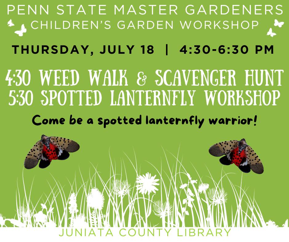 The next Penn State Master Gardeners children's workshop will be held on Thursday, July 18. Come join us for a weed walk and scavenger hunt in the garden and then learn about the spotted lanternfly. We are having so much fun with these workshops and hope that many families will join us in July.