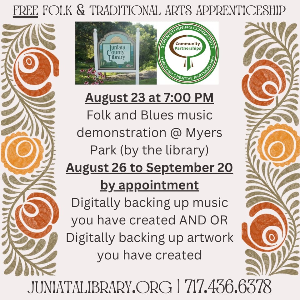 2) August 26 to September 20 by appointment: Digitally back up the music you have created. Work one-on-one with Vince Giordano (director of the Juniata County Library) and make sure your work is preserved for future listeners. Vince will personally work with you and use computer and online resources to store, catalog and preserve your music. Make an appointment: https://bit.ly/digitalbackupJCL2024