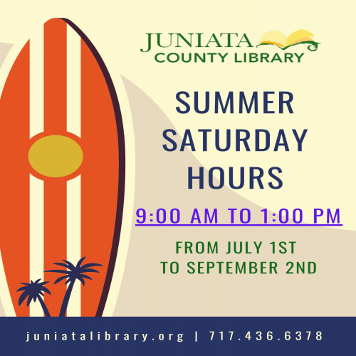 📣 Please note that from July 1st to September 2nd the library will close at 1:00 PM on Saturdays instead of 3:00 PM.