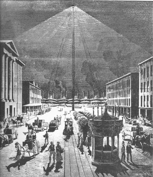 This week I learned about' 'moon lights' via Hayes Davenport's newsletter. Moon lights were an insane-sounding form of urban lighting that used carbon arc lamps suspended on massive towers. The lights were hundreds of feet tall and extremely bright, intended to illuminate several city blocks. Carbon arc was early form of electric lighting which relied on an electric arc passing through the vaporized particles of two closely-aligned carbon rods. They were labor-intensive to maintain (the carbon rods had to be replaced frequently) and eventually made obsolete by increasing building height blocking the light horizontally. Smaller, distributed filament-based streetlights became the standard, though a few cities still preserve towers as curiosities.