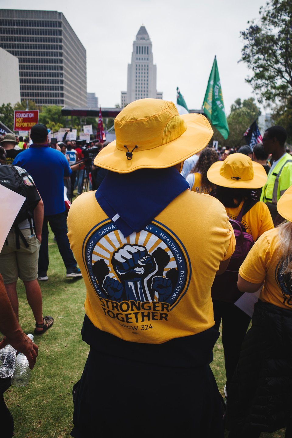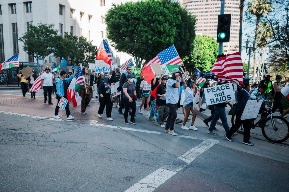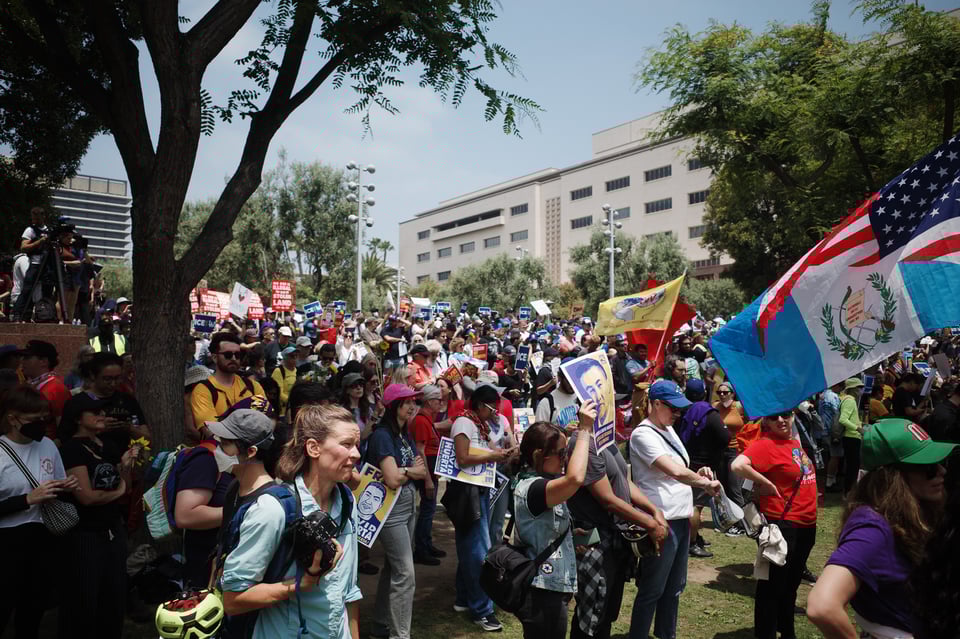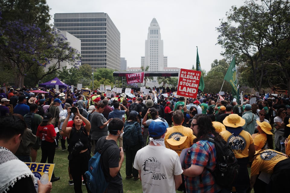 I've been to a few other rallies and marches, and worked downtown a few times this week. There's tense energy, a lot of spraypaint on the walls. Is Los Angeles in chaos? A war zone? Certainly not. Any damage and disorder is contained to a few square blocks, and doesn't amount to any more than the aftermath of a Dodger's championship win. The police are doing what they usually do, responding with disproportionate, militarized force. They're raking in overtime. Maybe if they formed lines instead to defend people from being snatched by ICE, they'd win some fans.