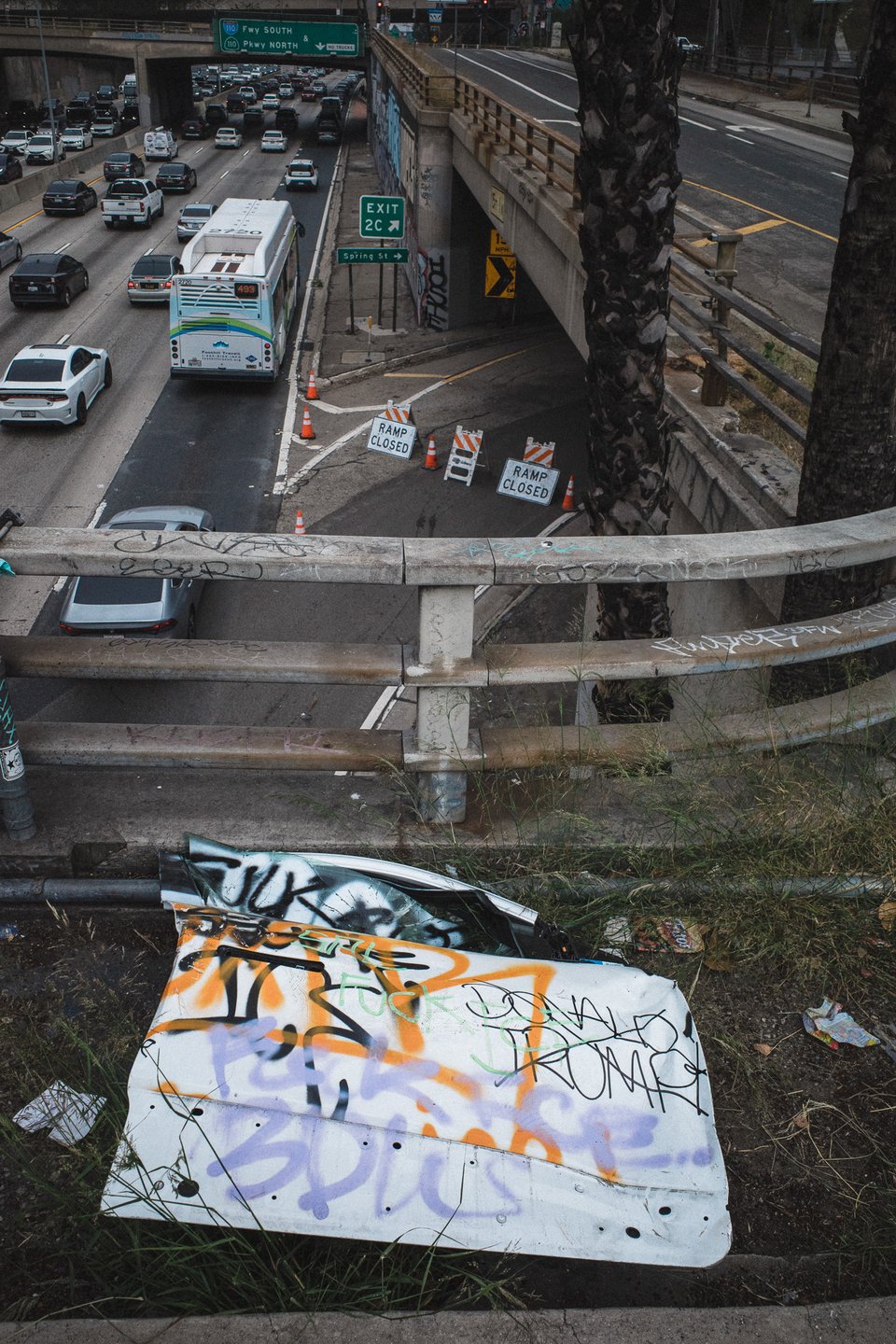 On Friday I saw posts of the skirmish in Paramount. It was dizzying to suddenly see street fighting at a suburban Home Depot, but my clearest thought was: at least people are fighting back. We didn't join in until Sunday, but while grocery shopping Clare and I decided it felt important enough to show up. So we took the train down, marching through the civic center and then standing among a crowd of a few thousand surrounding the sunken downtown section of the 101. Traffic was blocked in one direction, then briefly two. When cars were allowed to pass northbound, I was struck by how many cars responded with a honk or a raised fist in support. The approval was nearly unanimous. CHP was subjected to a torrent of small, mostly harmless objects as they kettled those occupying the highway and expelled them from the roadway. They fired dozens of flashbang grenades into the air, and I noted to pack earplugs for the next time. The detonations seemed ineffective on this crowd - I wonder if a city completely desensitized to year-round fireworks is immune to being intimidated by loud bangs. We left after a while, passing by the famous Waymos which were still merely damaged–not yet alight. The next day I got to see their remnants scraped off the ground with shovels.