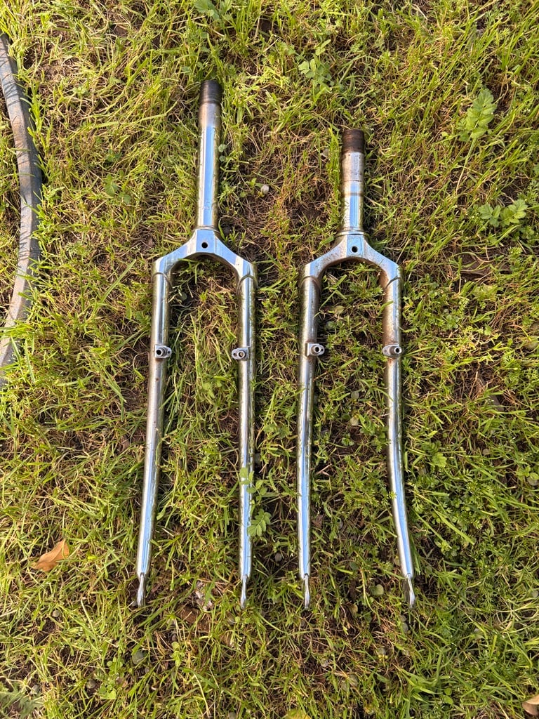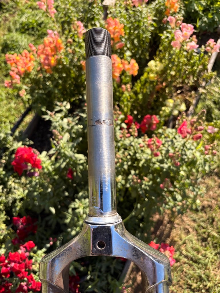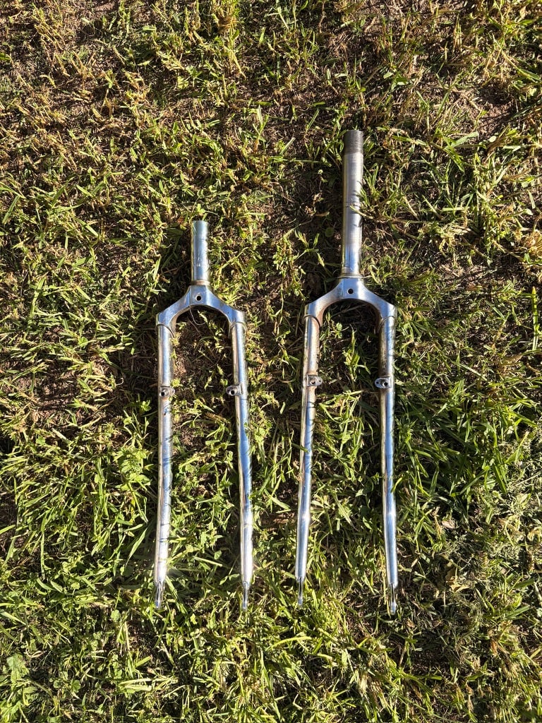 The new bike was too small for the fork to work on my frame. But our friend Riley builds custom bikes and does little problem-solving jobs like this. I dropped off the new and old fork to Riley on a Thursday evening, and he left the results on my porch the next day. He had cut the steerer off the old, bent fork, and welded it to the donor fork to extend it. I rebuilt the bike and was back in business. Just in time for the delightful season of evening social rides that have become a fixture the past couple of years.