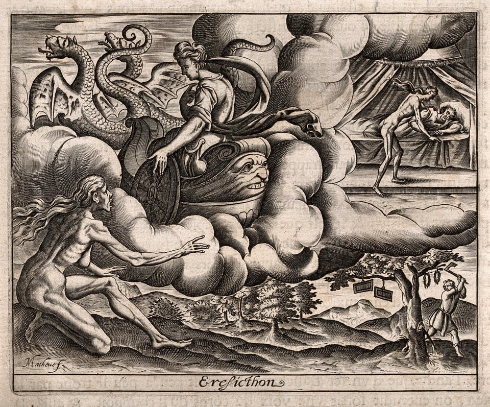 Travelers, it’s possible you don’t know the story of King Erysichthon. Arrogant, greedy, and not at all an environmentalist, Erysichthon ordered his men to chop down trees all over his kingdom. They comply but refuse to cut down one tree covered with offerings to Demeter. So Erysichthon grabs the ax and does it himself. Bad idea, for this tree is a wood nymph, who in her dying breath curses Erysichthon to a life of eternal hunger. The more he eats, the hungrier he becomes. He eats through all the kingdom's resources, eventually selling his daughter for food. Finally, with nothing left to eat, he begins to devour his own flesh. If you’re hearing both J.R.R. Tolkien and Stephen King in this tale, well, that’s the seemingly endless echo of Greek horror.