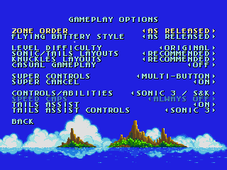 Now the gameplay options, as shown in the screenshot, are numerous but easy to make sense of. Zone order gives you the option to put Flying Battery into position between Carnival Night and IceCap, as it was before Sonic 3 was split into two parts. I actually prefer “original design” here, but setting that does affect the Part One and S&K options. I also keep Flying Battery Style as “prototype” as this gives the stage a darker sky background to fit with the previous level being set at night and the next stage at early daytime.