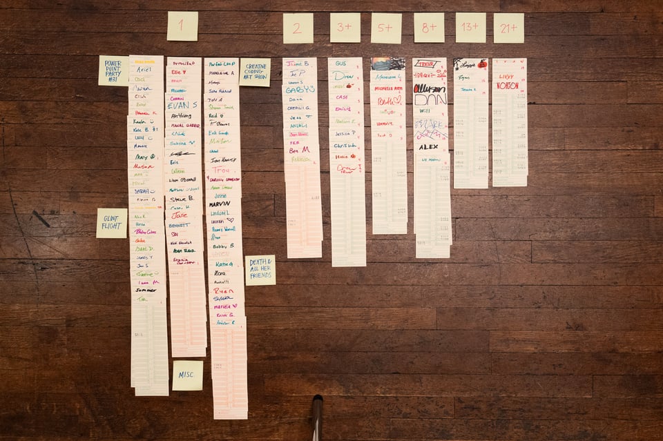 We have a time clock. Partially because, hey, we’re a Company! And mostly because we love having a physical record of (almost) everyone who’s been in the space. People punch in and out when they visit. At the end of each month, we stack up all the cards by visit count in the Fibonacci sequence. Here’s the data for October: