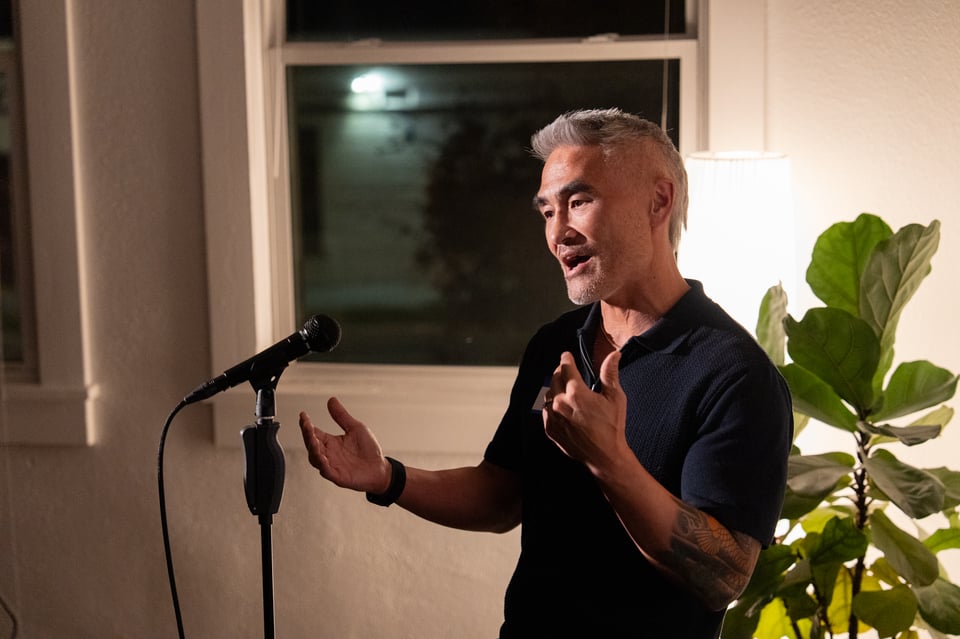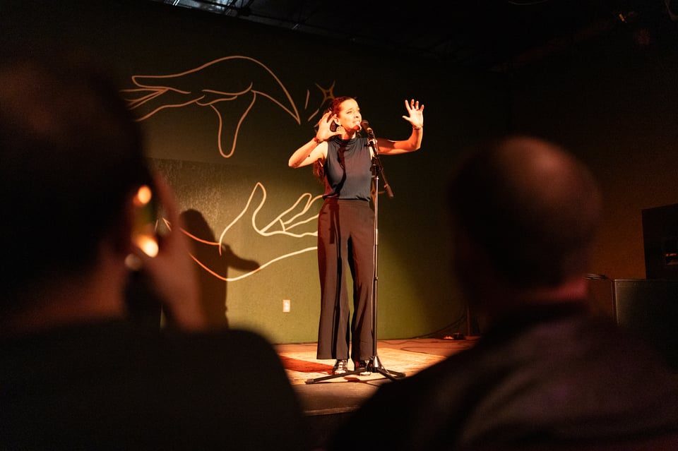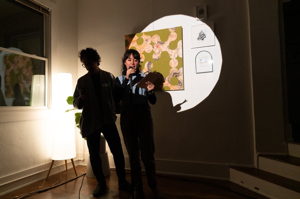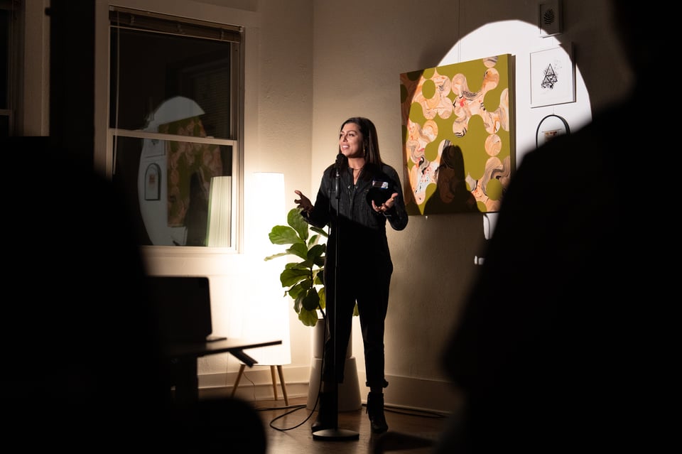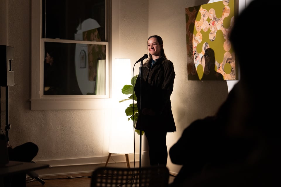 The Glint about opposites? The first one with interstitial music? That you came even though it was your one-year anniversary, because it was your one-year anniversary? Because she loves it? That you sat under the flower arch, wearing birthday hats with hearts taped on? How we heard stories of travels, travails, tags, and translation?