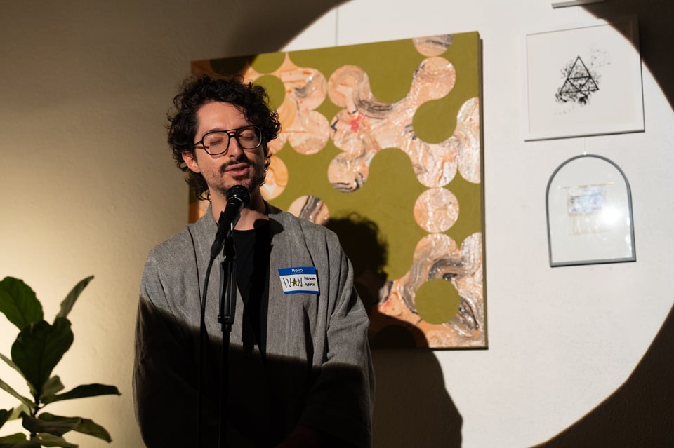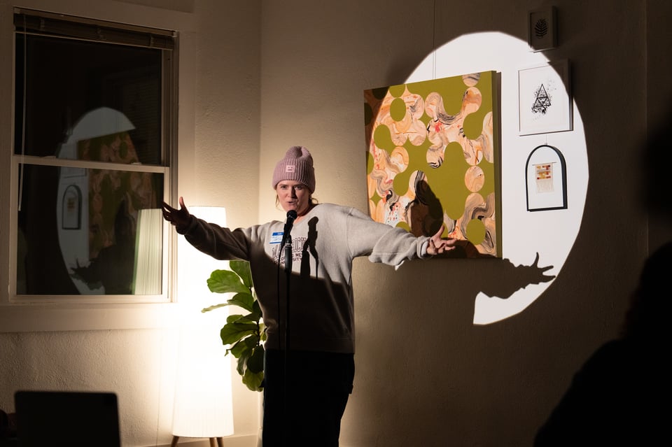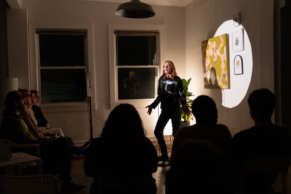A show and tell for original, amateur, creative works in progress. Each presenter has 10 minutes to spend however they choose (any mix of presenting, Q&A, workshopping, getting feedback).