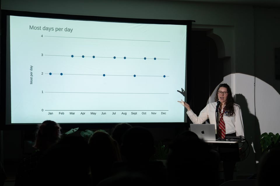 We have a time clock. Partially because, hey, we’re a Company! And mostly because we love having a physical record of (almost) everyone who’s been in the space. People punch in and out when they visit. At the end of each month, we stack up all the cards by visit count in the Fibonacci sequence. Here’s the data for December 2025: