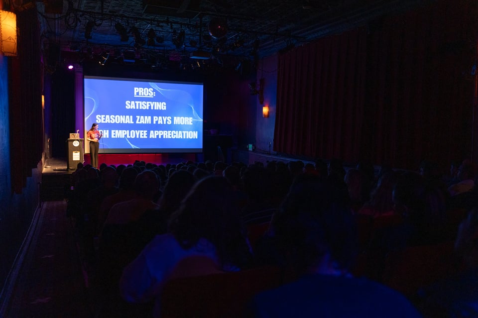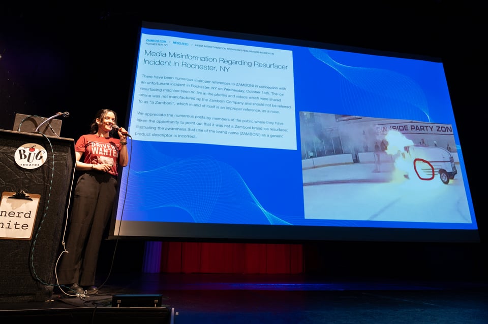 Twelve people giving 7-minute presentations about whatever they’re currently into. At past parties, people have presented about sneakers, riding the bus, figure skating, and death. It’s a wide mix.