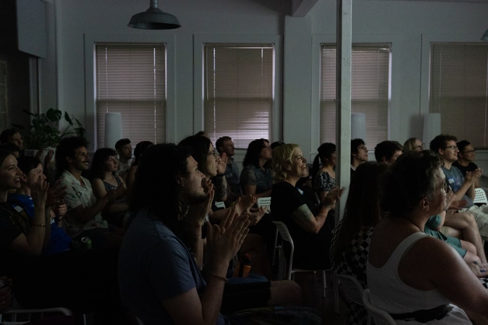 Thanks to Patrick and Jessica for helping us set up, to Justin and Halie for taking tickets, to Alex for keeping time and for performing an original interruption score, and to everyone for helping us reset the room. We apologize to all of the above, but especially Alex, for failing to credit you in the outro.