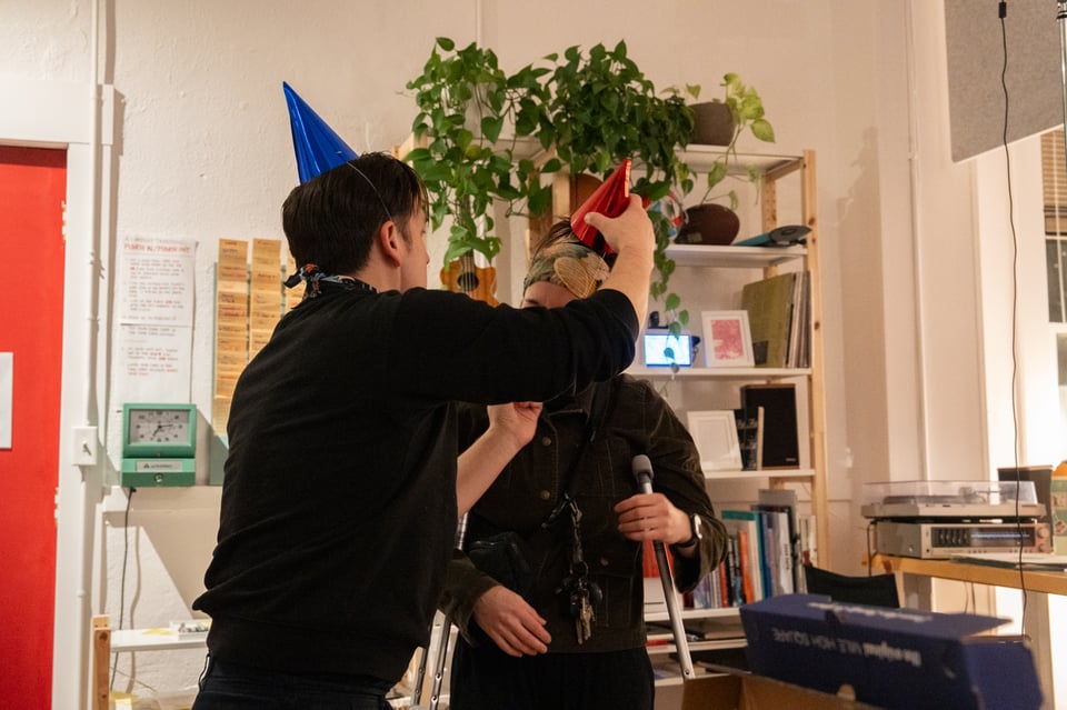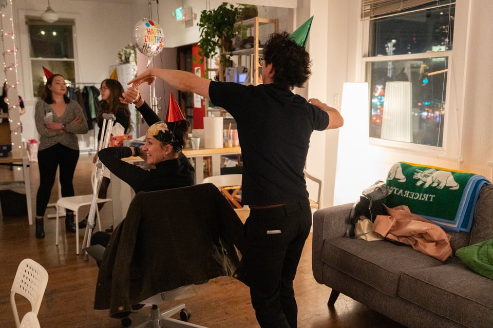 How we parked at The Made Shop to pick up the pizza, and the room filled up with loved ones? That Madeleine arrived on crutches, and Dan helped her put on a birthday hat, and she spent the evening rolling around on an office chair?
