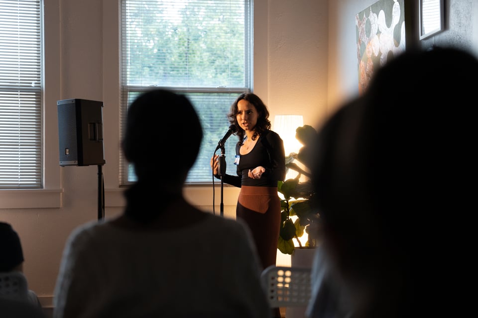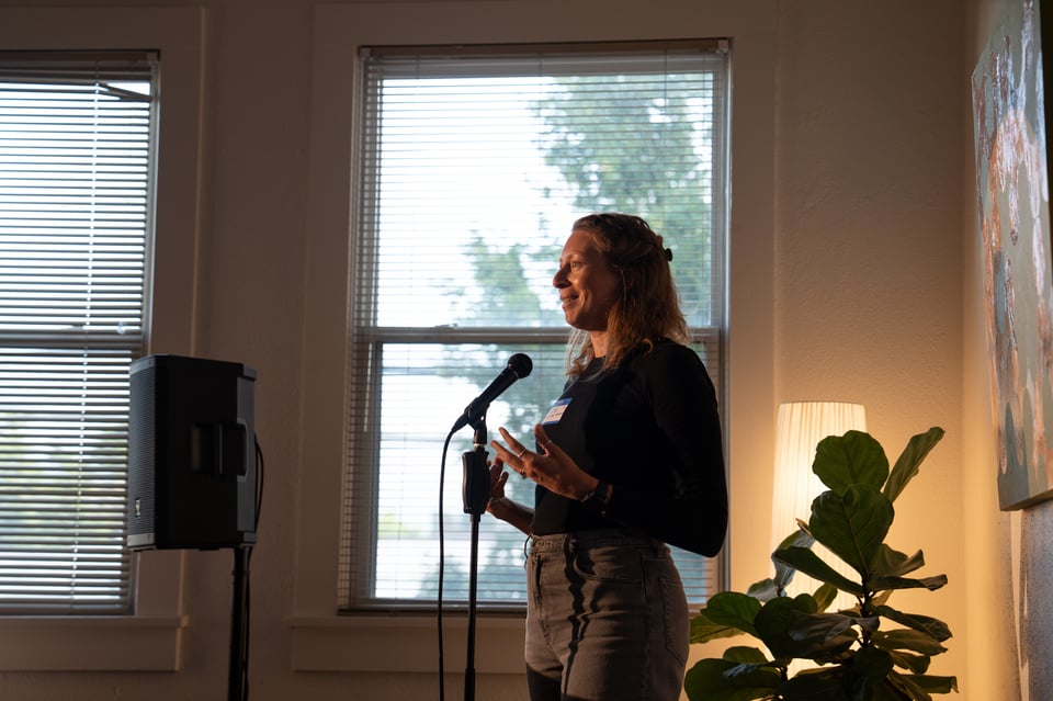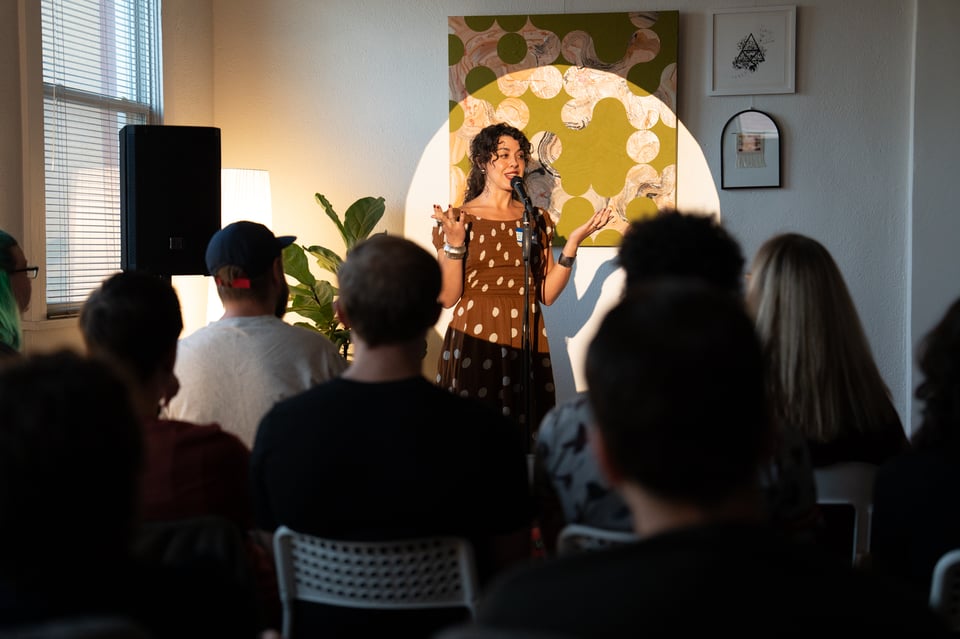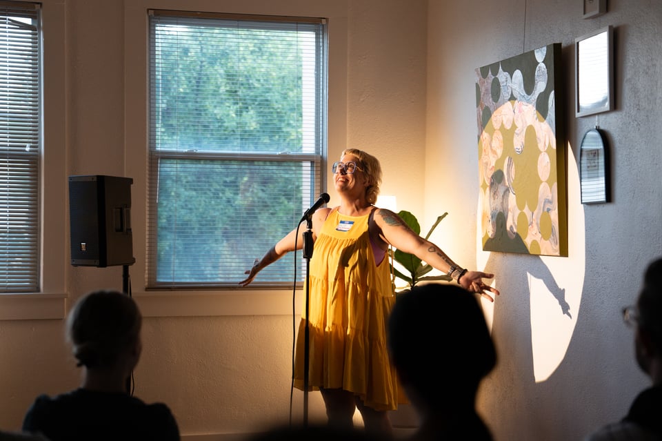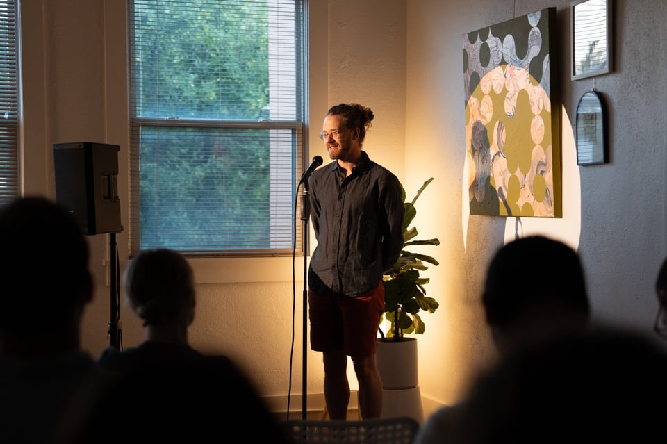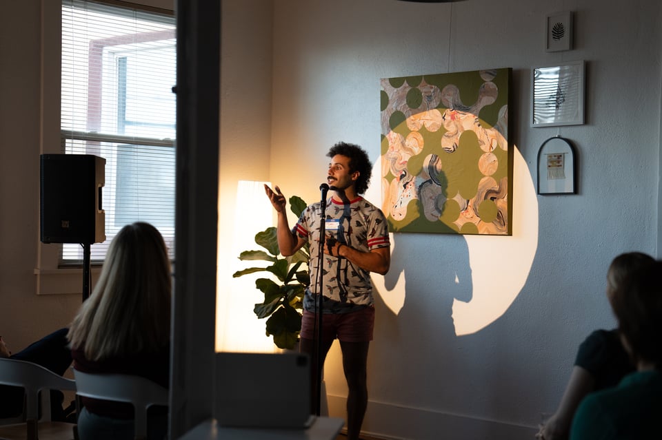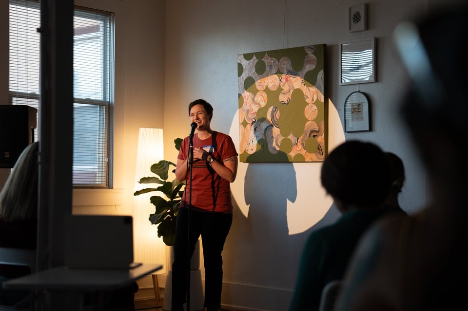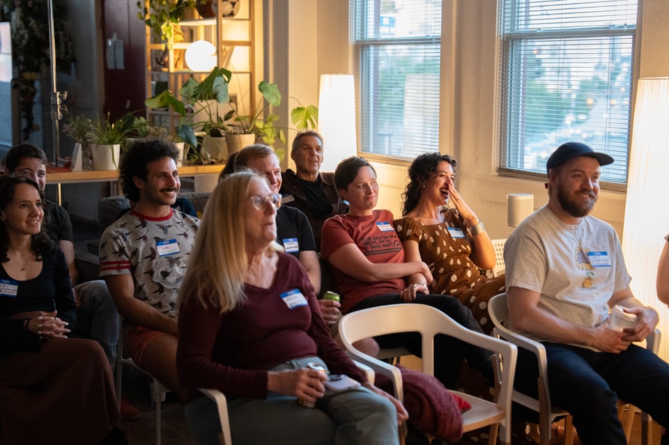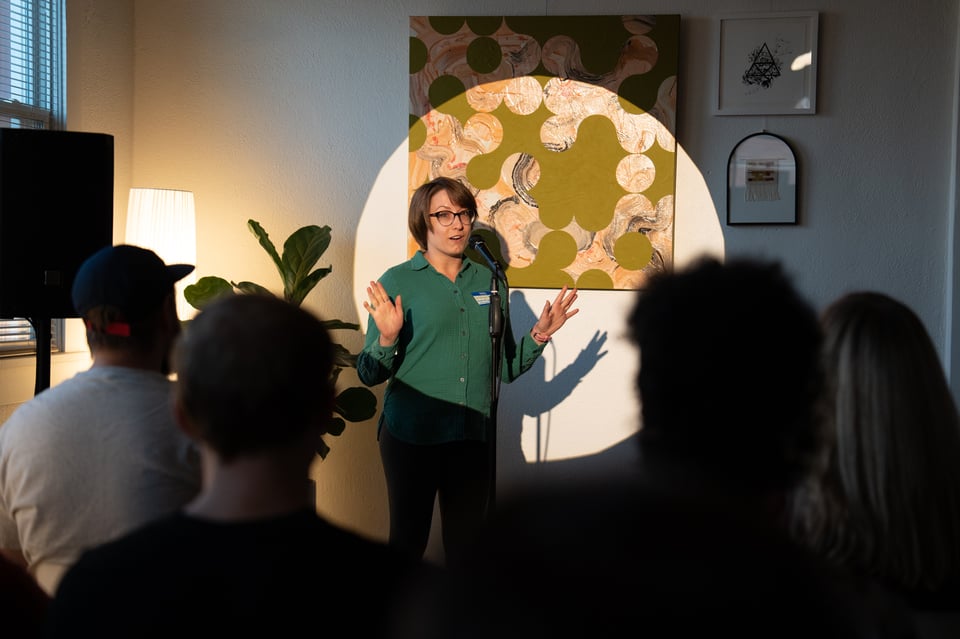 Twelve people giving 7-minute presentations about whatever they’re currently into. At past parties, people have presented about bees, frescos, roofing materials, and getting engaged. It’s a wide mix.