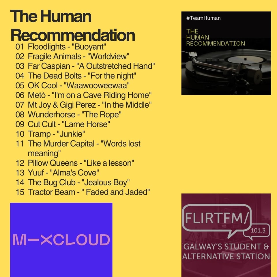 The Human Recommendation is a biweekly radio show on Flirt FM 101.3 in Galway city showcasing the best of indie & alternative music from Ireland and around the globe. But in this special interview side project, host Damien had to opportunity to chat with Yuuf, an exceptional four-piece instrumental band. The band members are Andrin (Percussion), Oli (Drums), Hugo(Guitar), Anthony (Bass) and hail from Switzerland, Denmark, France, and England. These awesome musicians blend their diverse musical ...