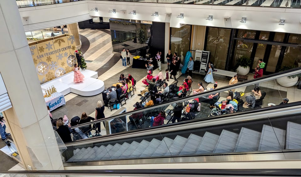 I remembered visiting SF Centre roughly twenty-five years ago, when I needed an outfit for my first grown-up job interviews. I rode the escalator up and up, gazing at floors thick with crowds, hoping to find the perfect suit at Nordstrom. The air had that vaguely nauseating mall smell, like cookies and perfume and new leather.