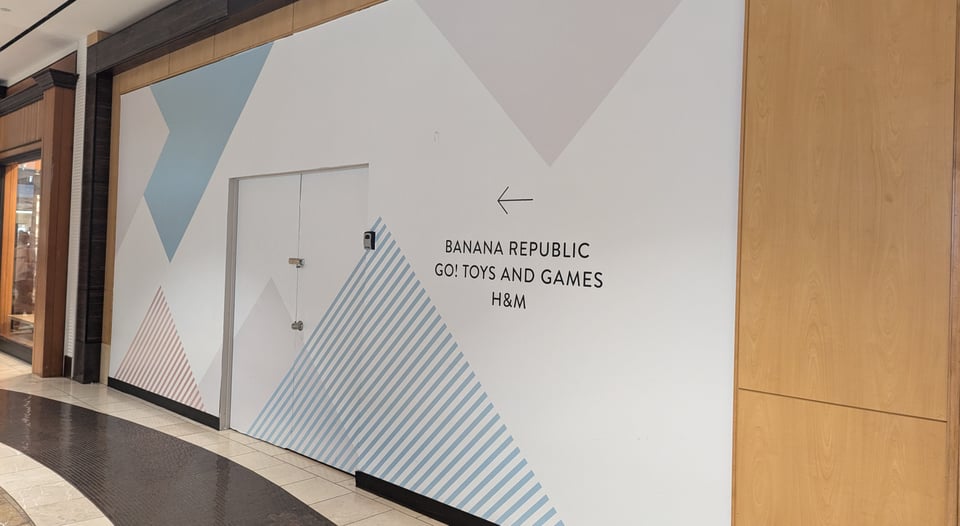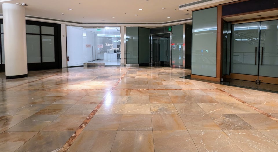 There are so many poignant ways the mall tries to hide the missing teeth on its shining promenades. Workers cover abandoned window displays with cheerful signage, as if the mall is supposed to have giant design displays instead of stores.