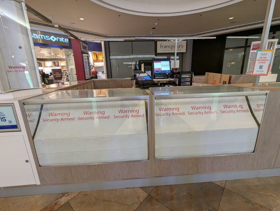Below, a glass countertop is filled with bleak signs that say “warning security armed.” It’s unclear what exactly is being secured, since its tenants and their wares are long gone.