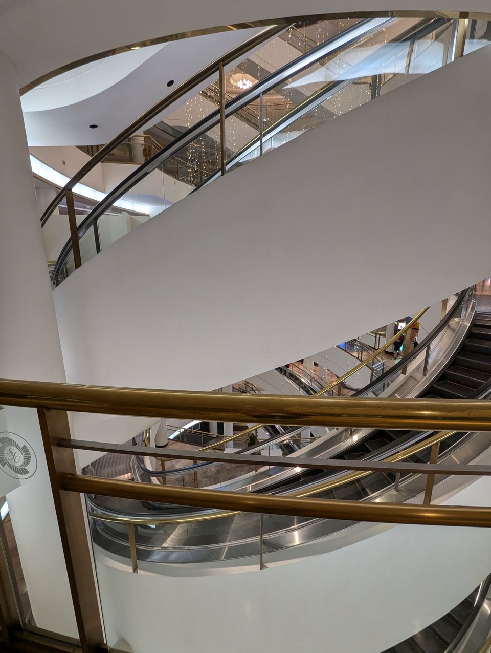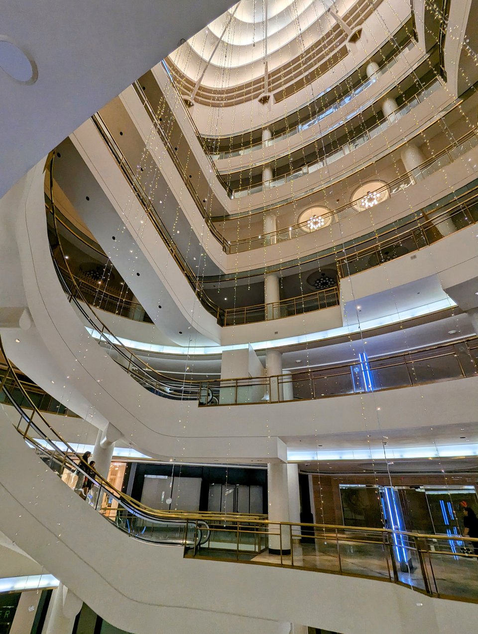 The mall seemed to degenerate into absurdism as I continued to ride the escalators up. Twinkling strands of gilded holiday decorations fell from the distant, illuminated ceiling, past five dark levels of unfilled retail space.