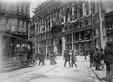 Inside, it boasted two floors of shops and an elevated orchestra stand beneath a luxurious, domed ceiling. Its founder Adolph Feist ran it basically as a collective of of pop-ups, with individually owned shops selling everything from food to books. The Emporium’s seven upper floors were devoted to office spaces. (You can see a great photographic history of The Emporium via the Internet Archive’s record of an SF Gate story by Peter Hartlaub.)