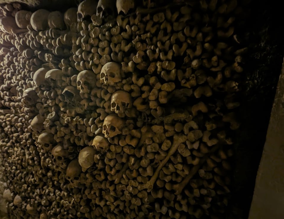 Over time, some workers chose to make morbidly pretty patterns out of the bones, piling them up in zig-zags or heart shapes, with skulls artfully placed between layers of femurs like some ultra-goth layer cake. And then in the death-obsessed nineteenth century, the Catacombs became a music venue and spooky attraction. As I admired the weirdness, I imagined the place full of nineteenth century romantic poetry fiends, all tricked out in black, carrying candles and getting emo about Beethoven.