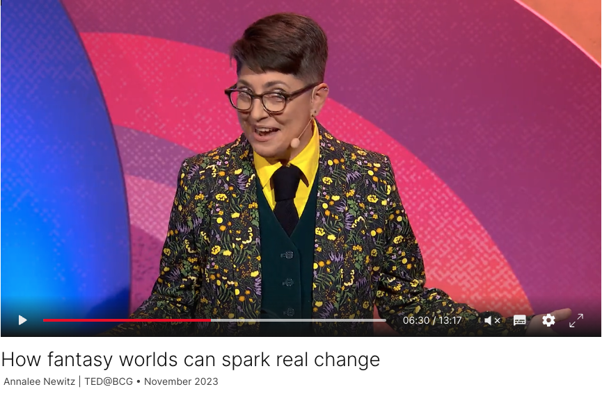 Last fall, I went to a small TED gathering in Paris to give a talk, and now it’s online! It’s about how escapist stories offer us a new perspective on the real world, and help us engage with our communities. I draw connections between cosplay, green infrastructure, science fiction, and public transit – and offer a message about how pleasure in stories can lead to real-world change. Plus, there’s goblincore. (Just watch it – you’ll see!)
