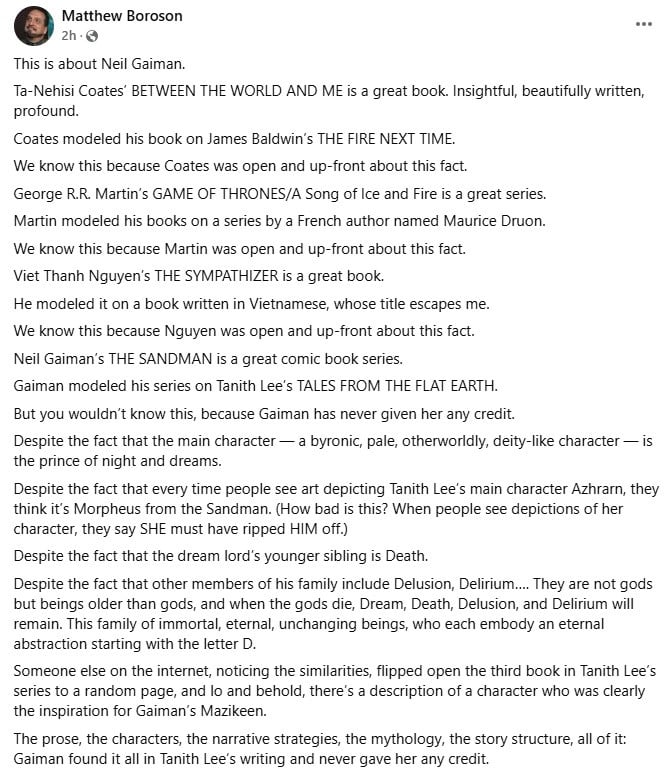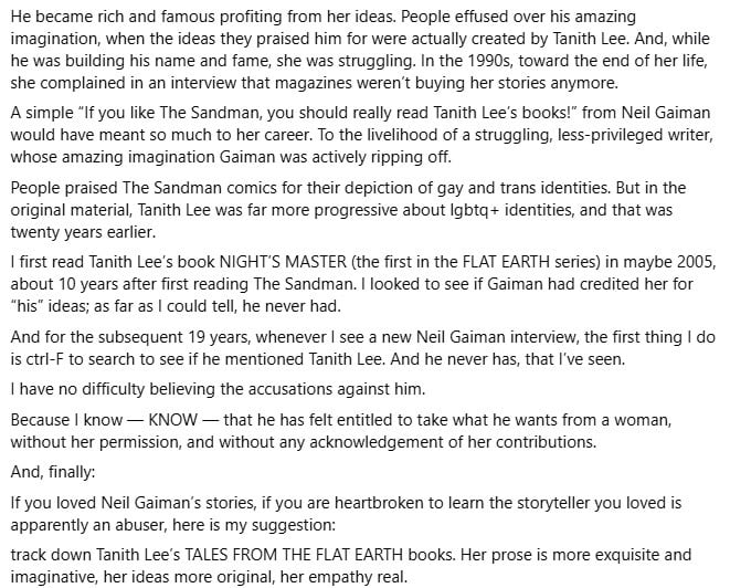 At the same time, the older issue of Gaiman heavily basing Sandman off the work of (female) fantasy author Tanith Lee without ever crediting her has arisen again (Lee had several times said she felt ripped off by Gaiman and avoided him at conventions and panels):