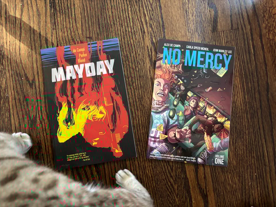 More old graphic novel stuff: The Image softcover of MAYDAY (left, its sequel is available for pay what you like on Panel Syndicate, see upthread) and the four volumes of my and Carla Speed McNeil’s teen survival book NO MERCY (right, only volume 1 pictured) are $5 each with any other book purchase.