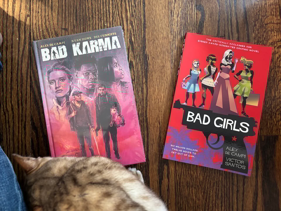 BAD TO THE BONE: The gorgeous 328-page (from memory but it’s a chonky boi) plus extras hardback edition of BAD KARMA (left, $25), substantially tweaked and improved from the Panel Syndicate edition (I re-lettered a lot, because I’m a perfectionist). Right, the Eisner-nominated BAD GIRLS (softcover, $20), a late-1950s tropical jazz noir about three women who have $6 million fall into their laps as Castro takes over Cuba. Only problem is, the money is the mob’s.