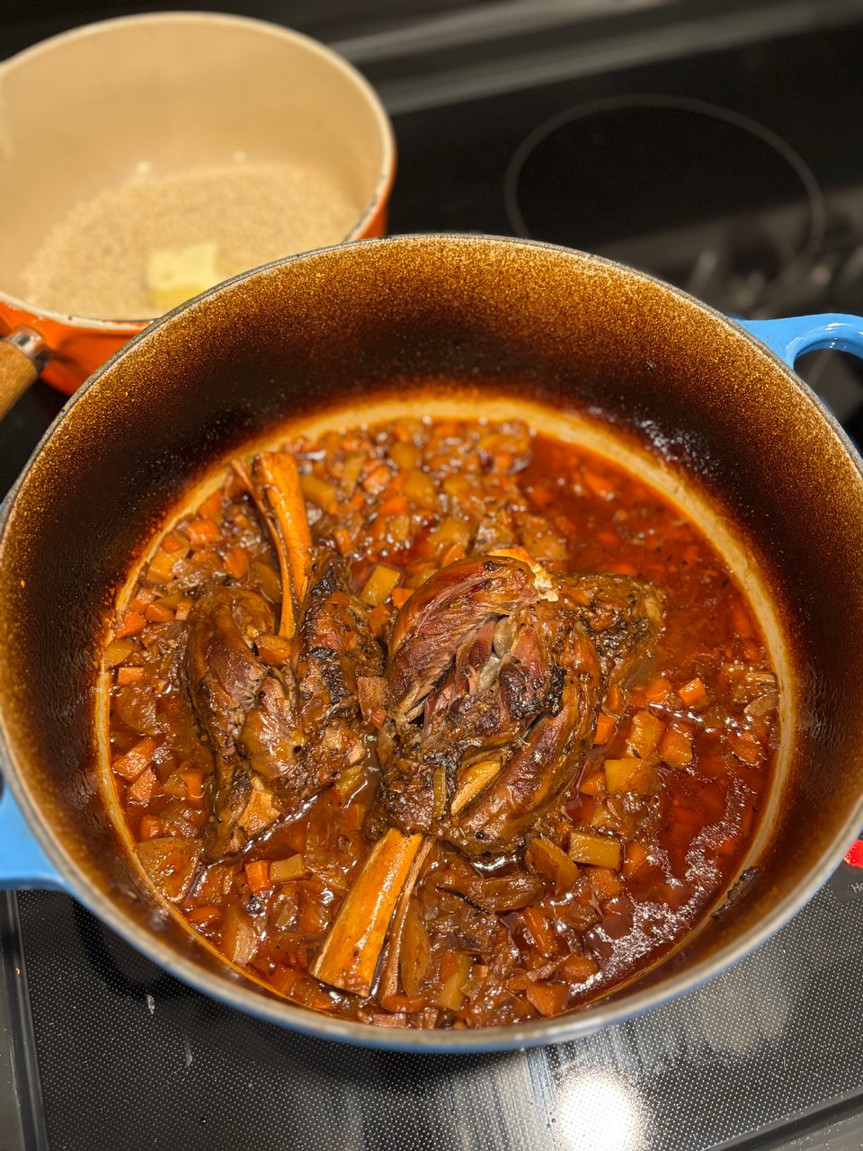 What I’m cooking: Just made braised lamb shanks, which was mostly this recipe but lmao, we do not throw out the veggies, we leave them in the gravy and serve them over couscous. Also subbed potatoes for turnips.