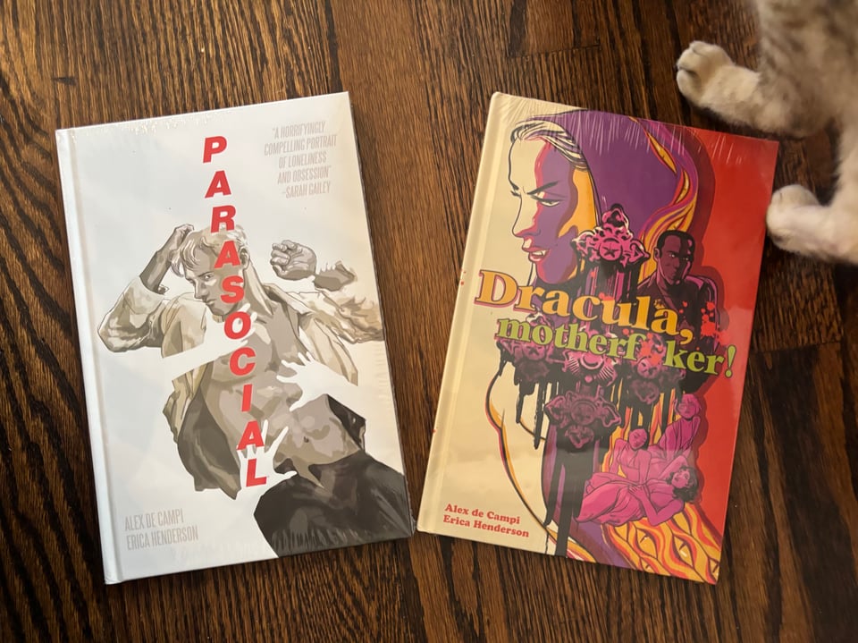 COOL HORROR STUFF: My two graphic novels with Erica Henderson. The Eisner-nominated PARASOCIAL (left, $18) is like a modern-day social-media MISERY. If you’ve ever spent significant time on Tumblr, AO3, or in fandom circles / at pop culture conventions, this book is a must-read. DRACULA, MOTHERF**KER! (right, $15) is a 1970s LA Dracula noir novella with stunning visuals.
