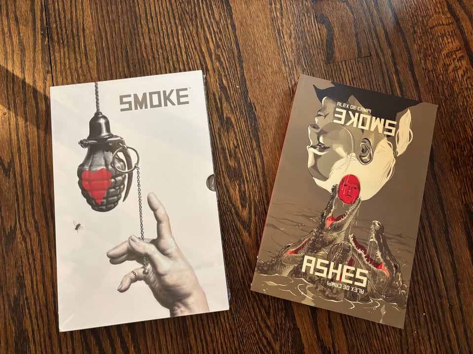 SMOKE/ASHES: Early (2005!) postmodern sci-fi thriller graphic novel of mine. Great artists: Igor Kordey, Bill Sienkiewicz, etc. I still have a fair few of the cased, signed & numbered hardback (left, $20) as well as the paperback (right, $12). Please make them go away.