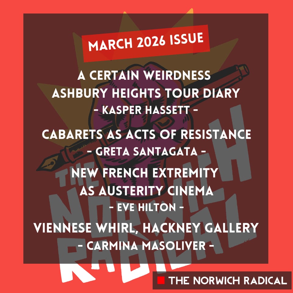 Welcome to the March 2026 Issue of The Norwich Radical! The horrors persist, but so do we. After a leaner issue last time, we come back with a fully stocked arts-centred issue this month, as our community of writers proves that there are (still, always, and forever) pockets of joy, creativity, and resistance in the face of the bastards trying to grind us down. And trying to grind everyone and everything down they are.