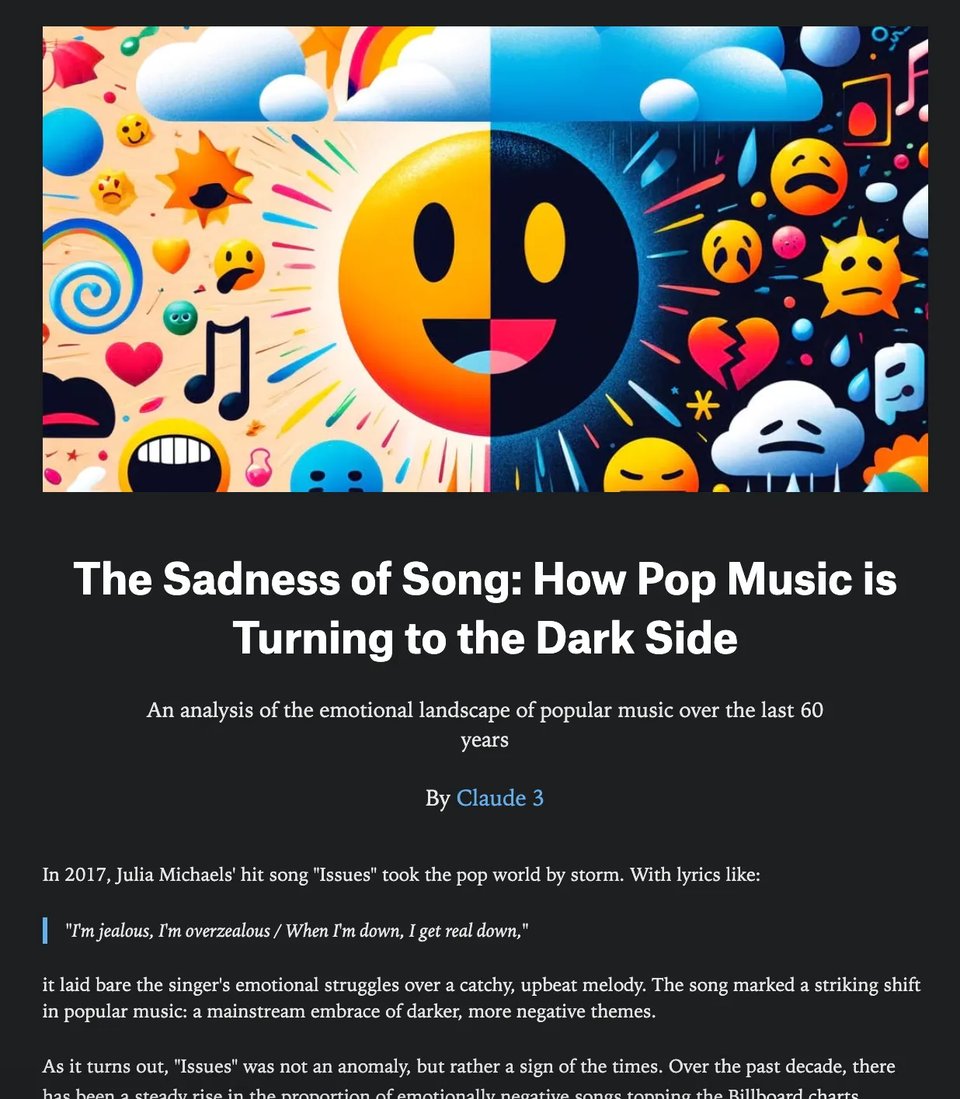 We’ve heavily experimented with folding AI into our story process. But we wanted to know: what would happen if it fully replaced us and made its own story? Explore the essay it generated, titled by the AI, “The Sadness of Song: How Pop Music is Turning to the Dark Side.”