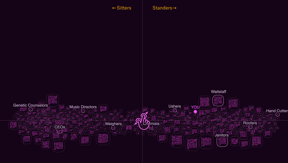 The US workforce can be divided into “sitters” (like programmers and lawyers) and “standers” (like servers and construction workers). Alvin Chang’s newest project looks at what we can learn from this labor split.