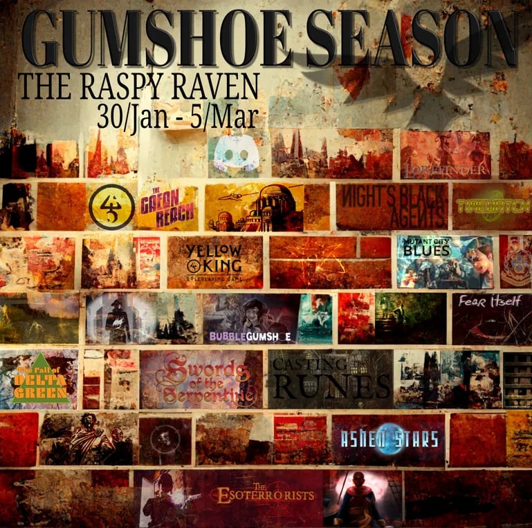 Gumshoe and Phase Four. Gumshoe has a special place in my heart, I bought the books when I had no inkling of coming back into the TTRPG hobby, I was just curious about what the latest incarnation of a Cthulhu roleplaying game was all about. I read and collected them, a lot of them, as I had more money than sense at the time. But it wasn’t until I finally got to run The Kingsbury Horror, followed by The Black Drop, that they came alive for me. So, similarly to Free League, I aimed to run every “official” Gumshoe system and a few unofficial ones. I enlisted some amazing GMs, some first timers like Jason, others experienced and friends of the server like Rob, Nigel, Martin, Syd, Fabio, Hector, Andy, Carl & PT and some fantastic designers of RPGs, old favourite Paul Baldowski, Paul “Liminal” Mitchener, Jesse “Between the Devil and the Deep” Covener and Sean F Smith, producer of reams of indie RPGs and then last minute we twisted the arm of Kevin Kulp to run Swords of the Serpentine. With Promotional help from Cat Tobin at Pelgrane, we had around 55 people ready to sample the delights of Gumshoe and our server members now stand at 200+.