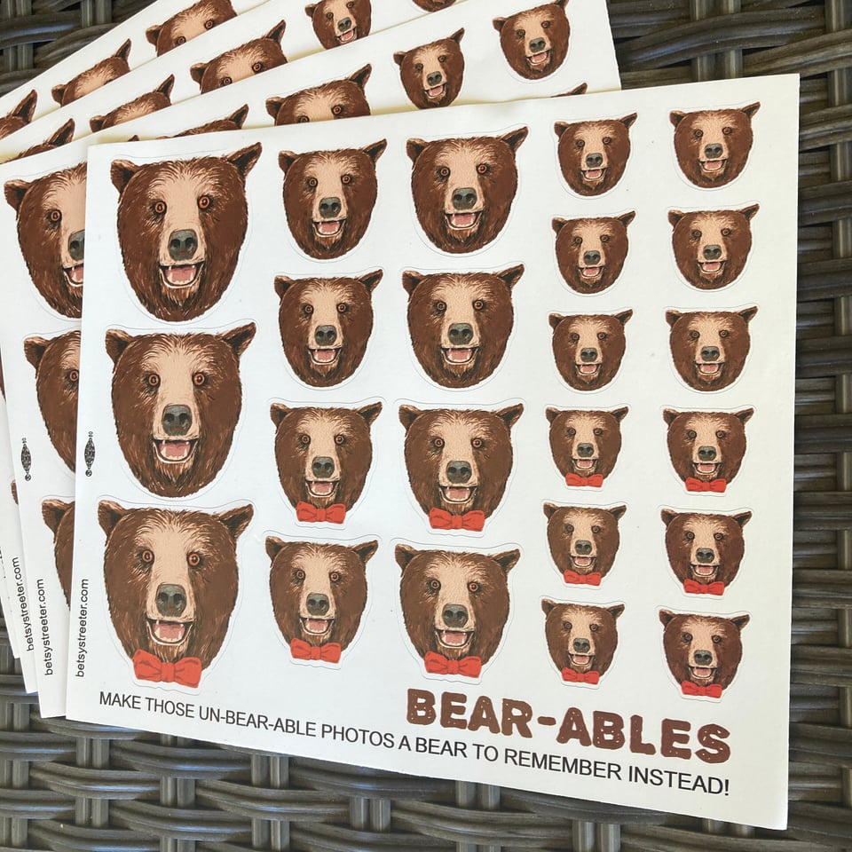 OK this is a silly project - we made lil bear face stickers called BEARABLES that can be used to cover over cringe-y photos from the past - so you don’t have to destroy those photos where you look cute but your ex is in em. Or heck, put em wherever you want. There’s also a digital version so you can auto-trace on your iPhone or Instagram or what have you and use em on digital photos/stories. Bears all over everything for everyone!