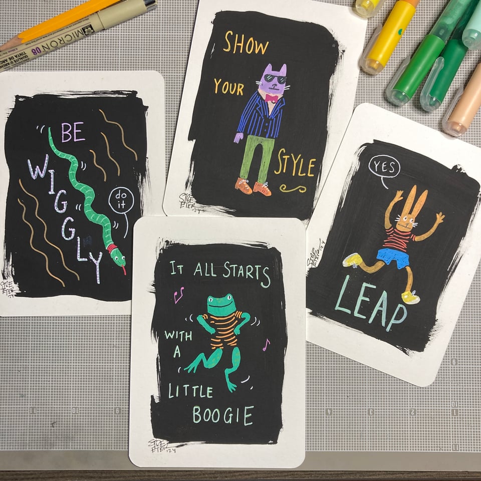 There’s art now! I have been making spontaneous BunnyFrogCatSnake paintings and putting them in my Etsy shop, which is now the BunnyFrogCatSnake and Friends shop. They are super inexpensive and silly! Because everyone deserves a lil friend to hang out with.