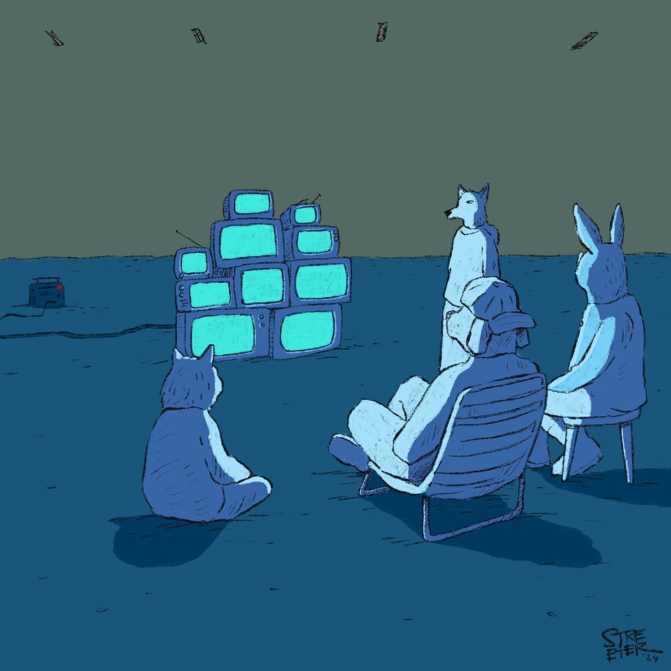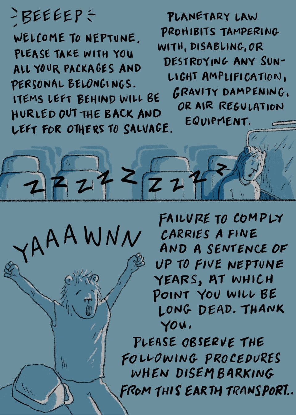 More concept art for Neptune Road, in which Neptune residents gather to watch the news. Hopefully one of the salvaged TVs from the last drop from Earth will actually work. The sunlight amplification system, switched off for the night, can be seen in the sky