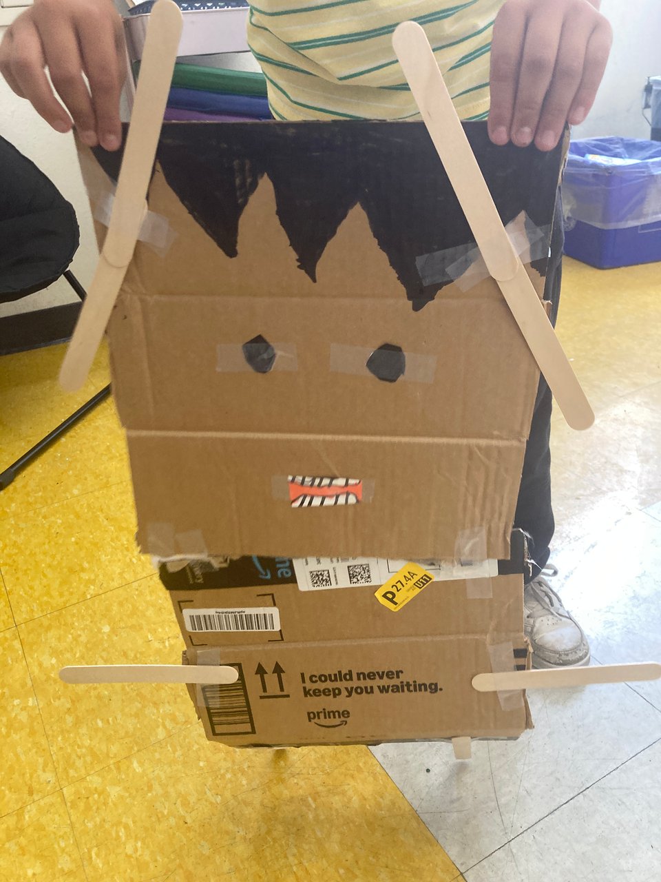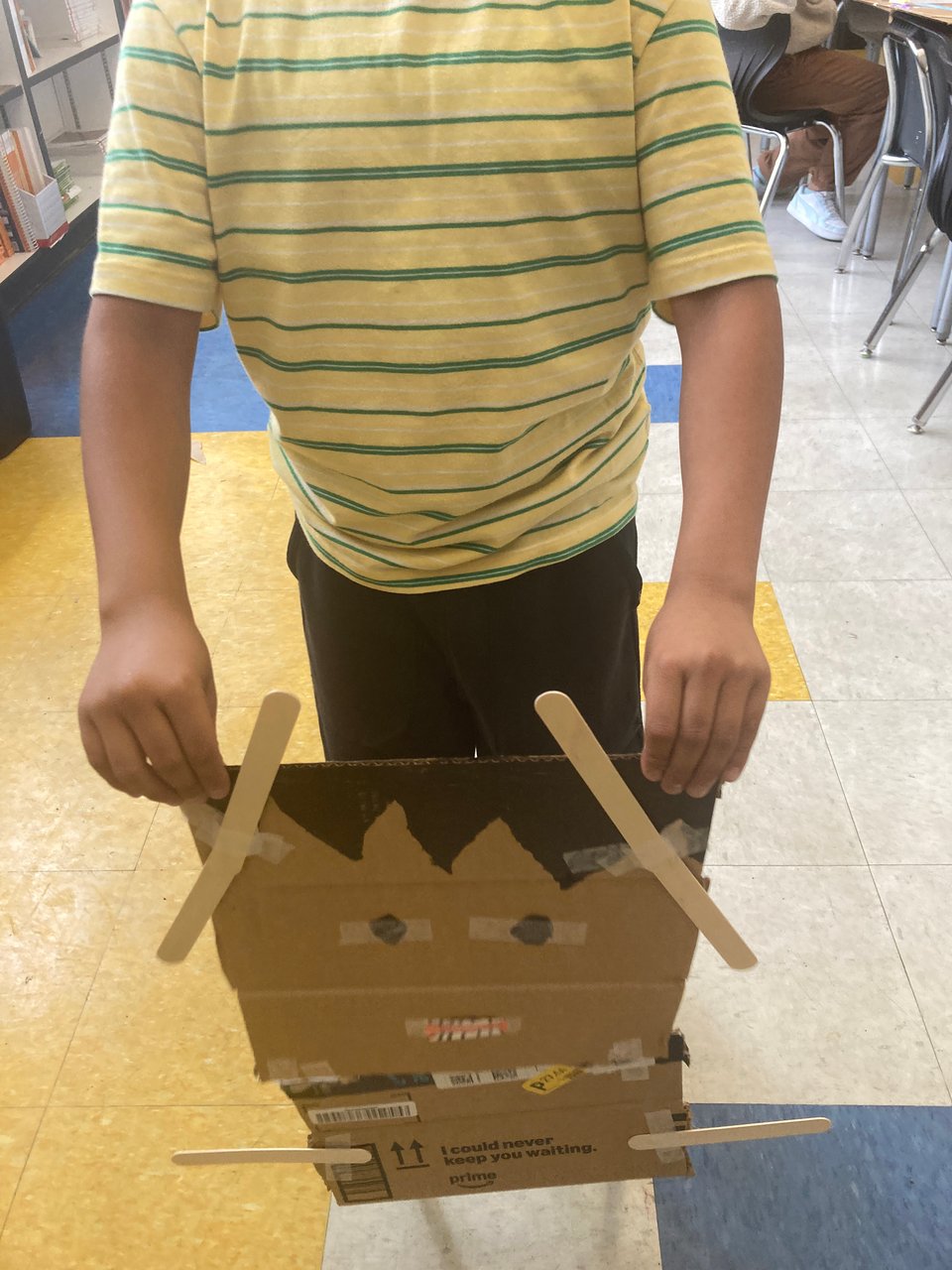This week, one of my students took it upon himself to make a person out of cardboard. He made a face first, and then made it fold so the mouth opened and closed. Then he added a body, and then found some popsicle sticks for arms and legs. The last part of class was spent cruising around the room with his new friend. The other kids enjoyed, this also.