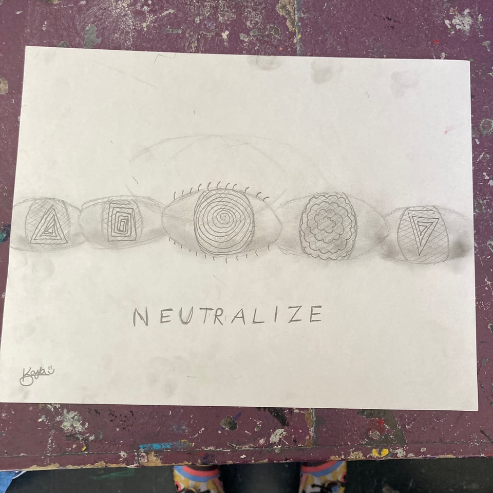 This was by a student on an art tour at Richmond Art Center recently. I want to say she was in sixth grade (I really need to label these!) - and she explained she has this motif where she draws eyes with the word “neutralize.” It’s just fascinating. I wonder if part of her brain is actually saying “neutral-eyes.” She wanted to talk about it a lot and I helped her come up with the shape variations inside each pupil.