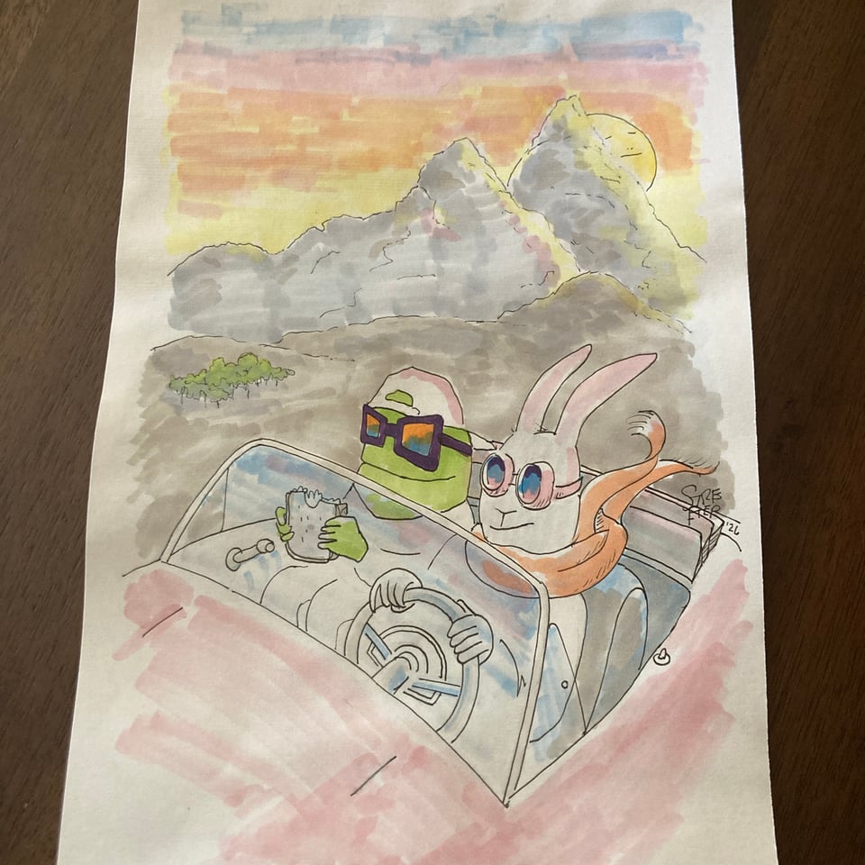 What a mess this is. Just a mess made over breakfast for a few days. Started with scribbling lines and then finding some shapes in there and that became some friends on the road passing by something that vaguely resembles what it looks like driving past Mount Shasta on Interstate 5 in far Northern California. Pen, and then watercolor a little, and then dried out alcohol markers. Just whatever was around.