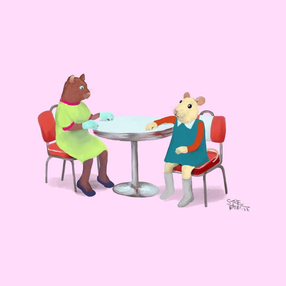 A print of these friends recently sold at a lil show in Livermore, my hometown. Sabrina and Alice. They’re from the book Sofa Stories. I very much enjoyed making their vintage 1960s looks.
