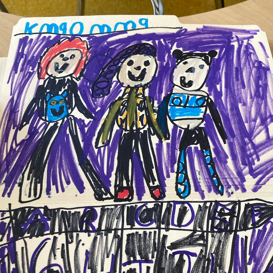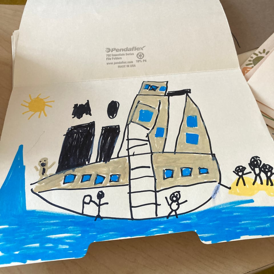 Please enjoy this depiction of the Titanic that one of my students did in afterschool art. They were decorating their folders to keep their work in. He informed me that in his version the ship changes course at the last minute and everyone is saved. Probably because of that fellow yelling in the front there.