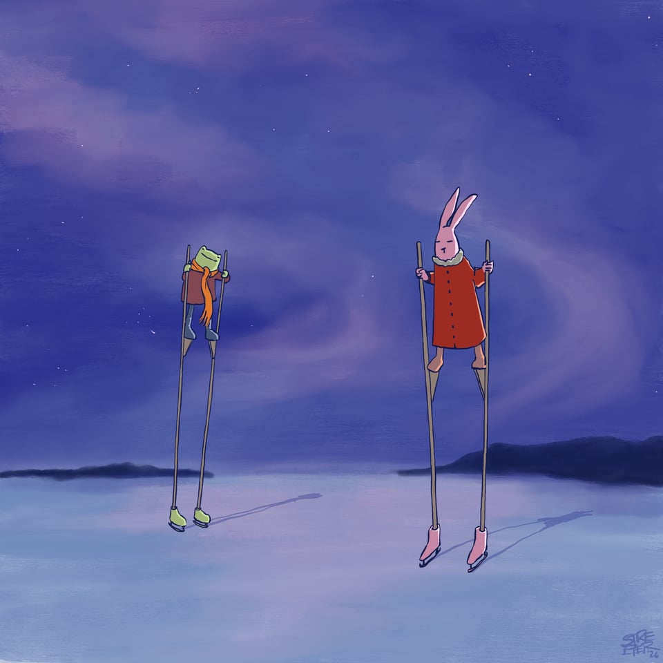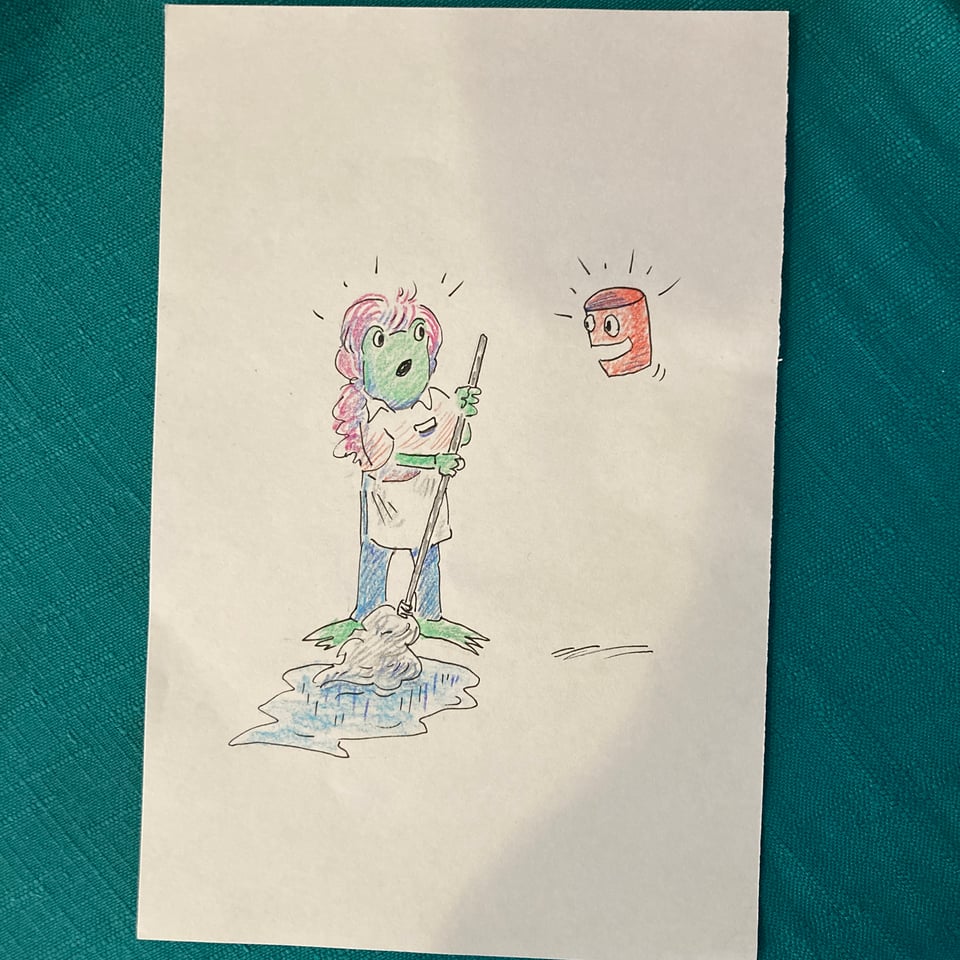 This week, the story featured a frog with pink hair who works as a janitor at Costco, and who accidentally falls through a magical portal and thus meets a talking cup, who gives advice.