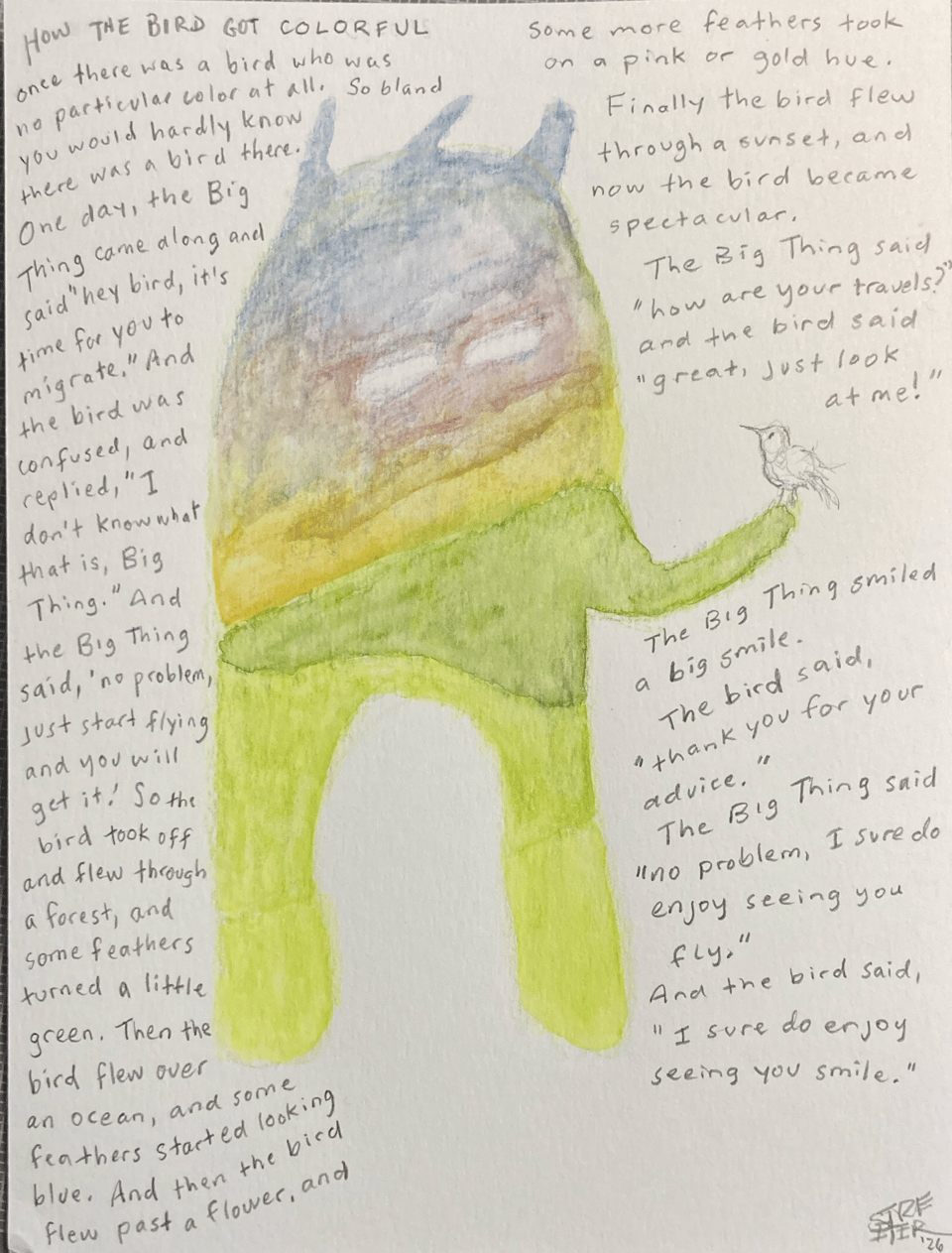 The tiny story up there at the top is a micro version of all this. I started that because I had these watercolor pencils out by where I eat breakfast. I had a thought about a big fellow who had the earth inside of them because I love things like that. So I started that, and then after a while, I added a wee bird. I drew the bird just in pencil, meaning to go back, but then I liked the bird being in pencil and the big fellow being the world, and then a story came out. This is the order in which this came together. Which was pretty much a function of having the pencils out where I eat breakfast. And some conversations I have had lately. I think. This was not analyzed along the way.