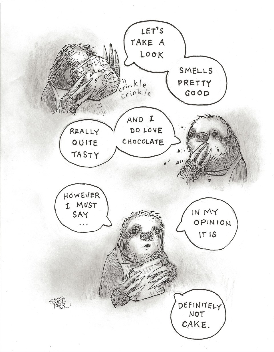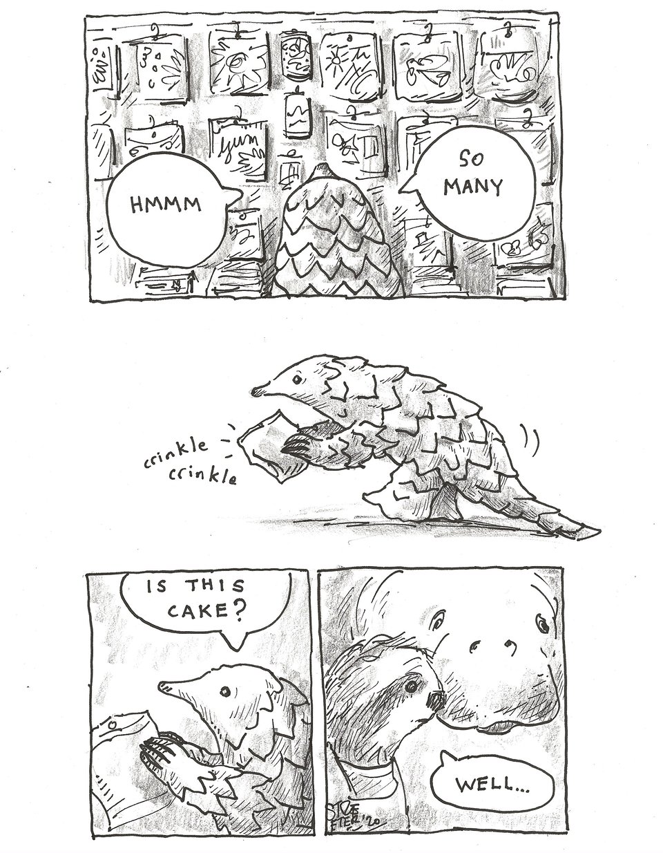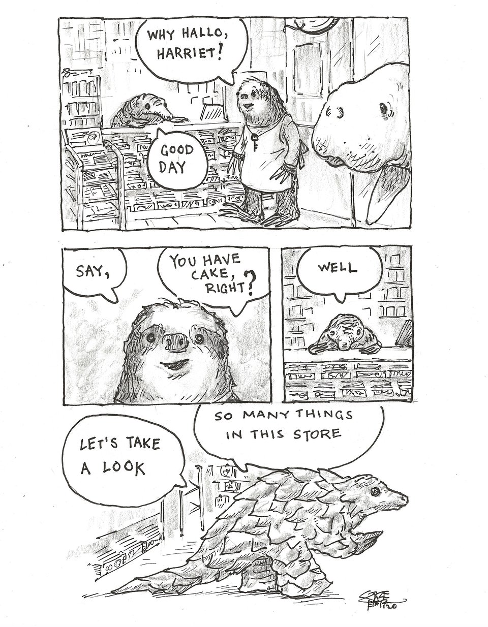 It was that first peek over the fence/hedge that got things going with Manatee and then Sloth. They soon shared some soup and then they were off to look for Kitty, who had disappeared, and they knew Kitty liked cake so they looked at the local quickie mart, which was run by Harriet the Pangolin, who was unclear on what exactly is cake