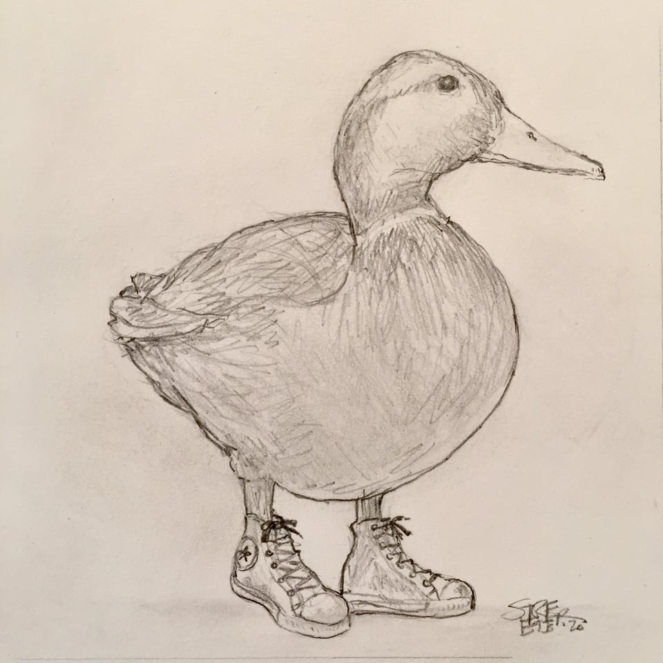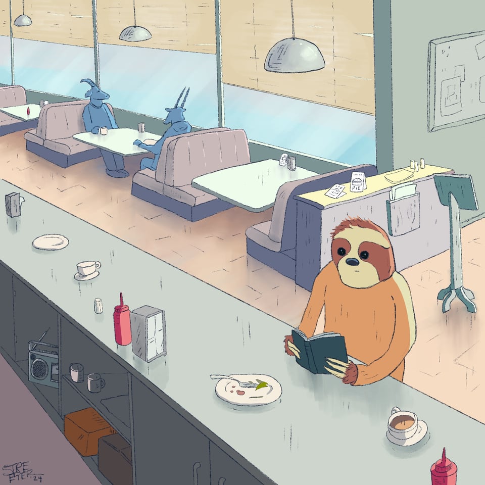Neither Sloth nor Manatee have need of shoes, but here’s a drawing from some time ago that involves a good book and some coffee at a diner, where you could wear your favorite shoes if you wanted to..