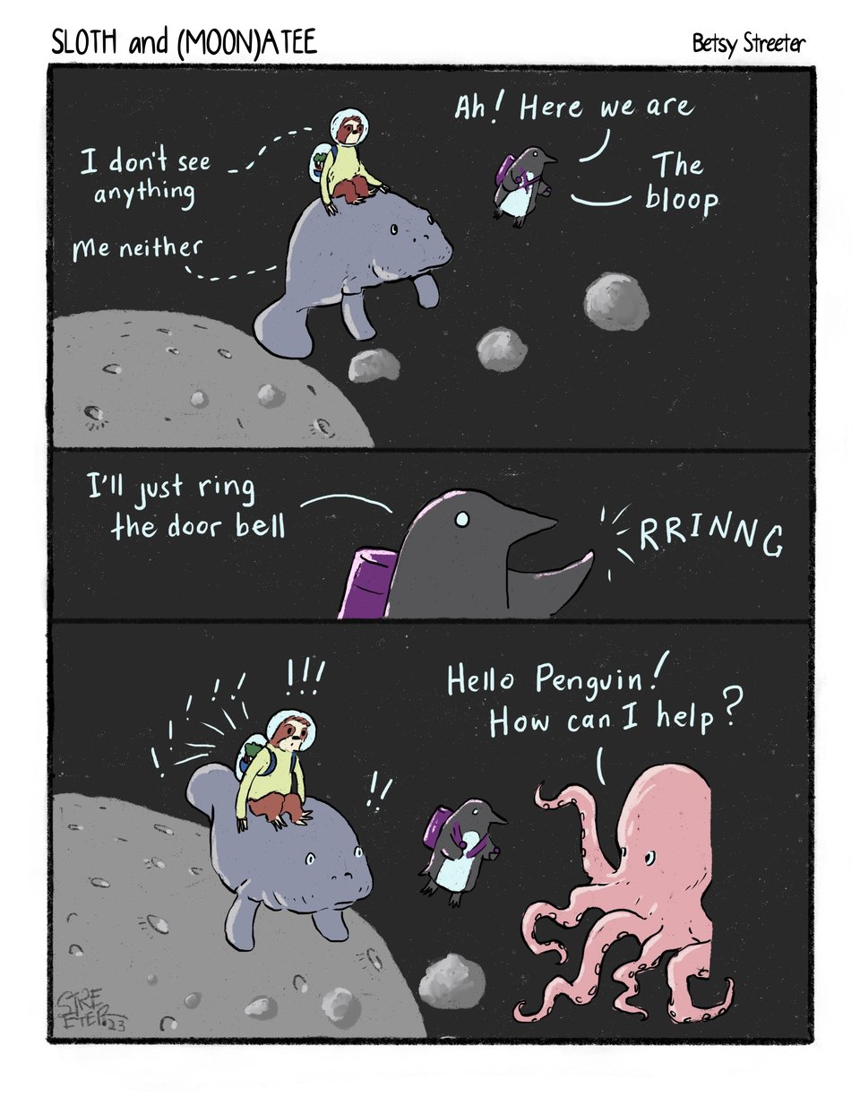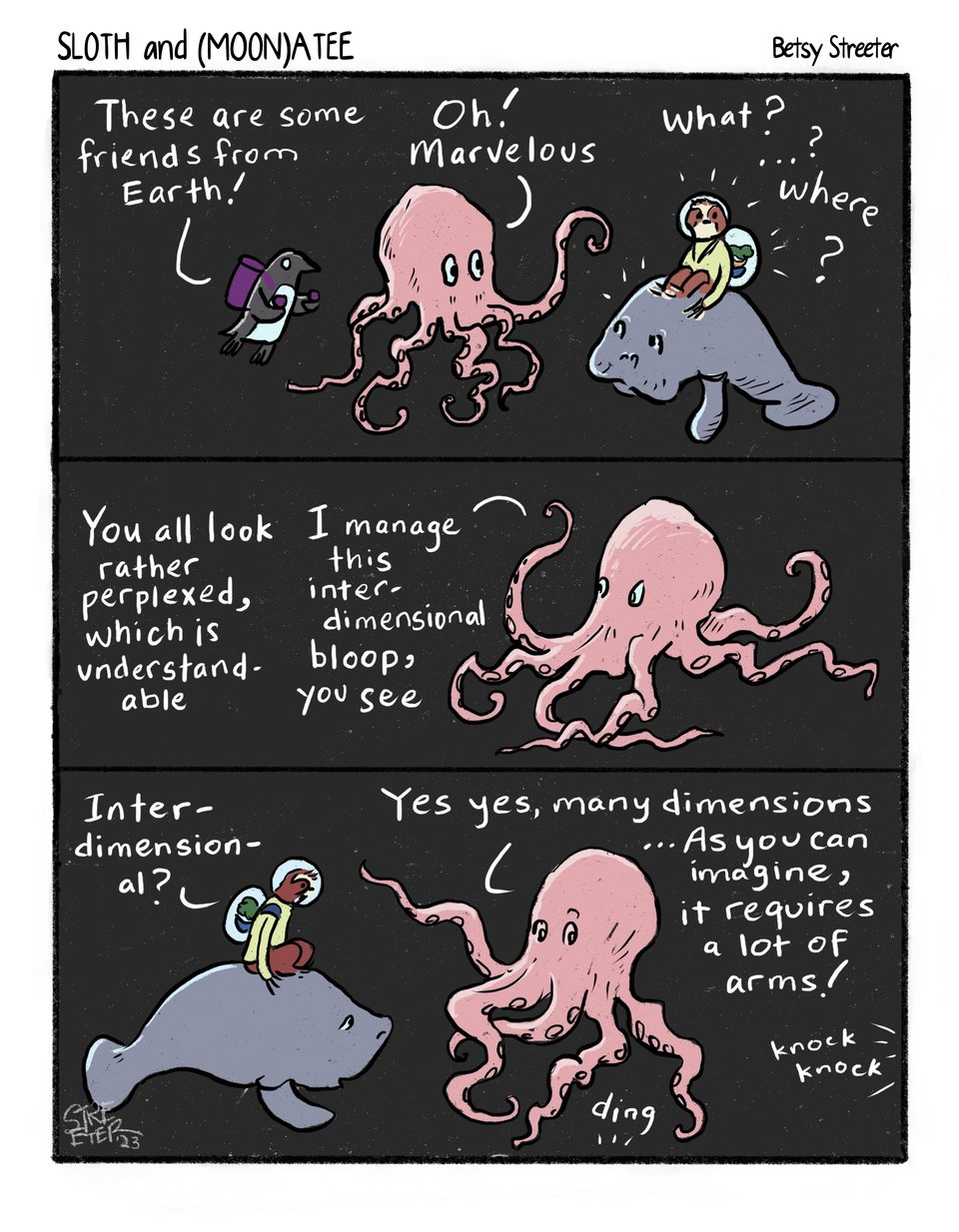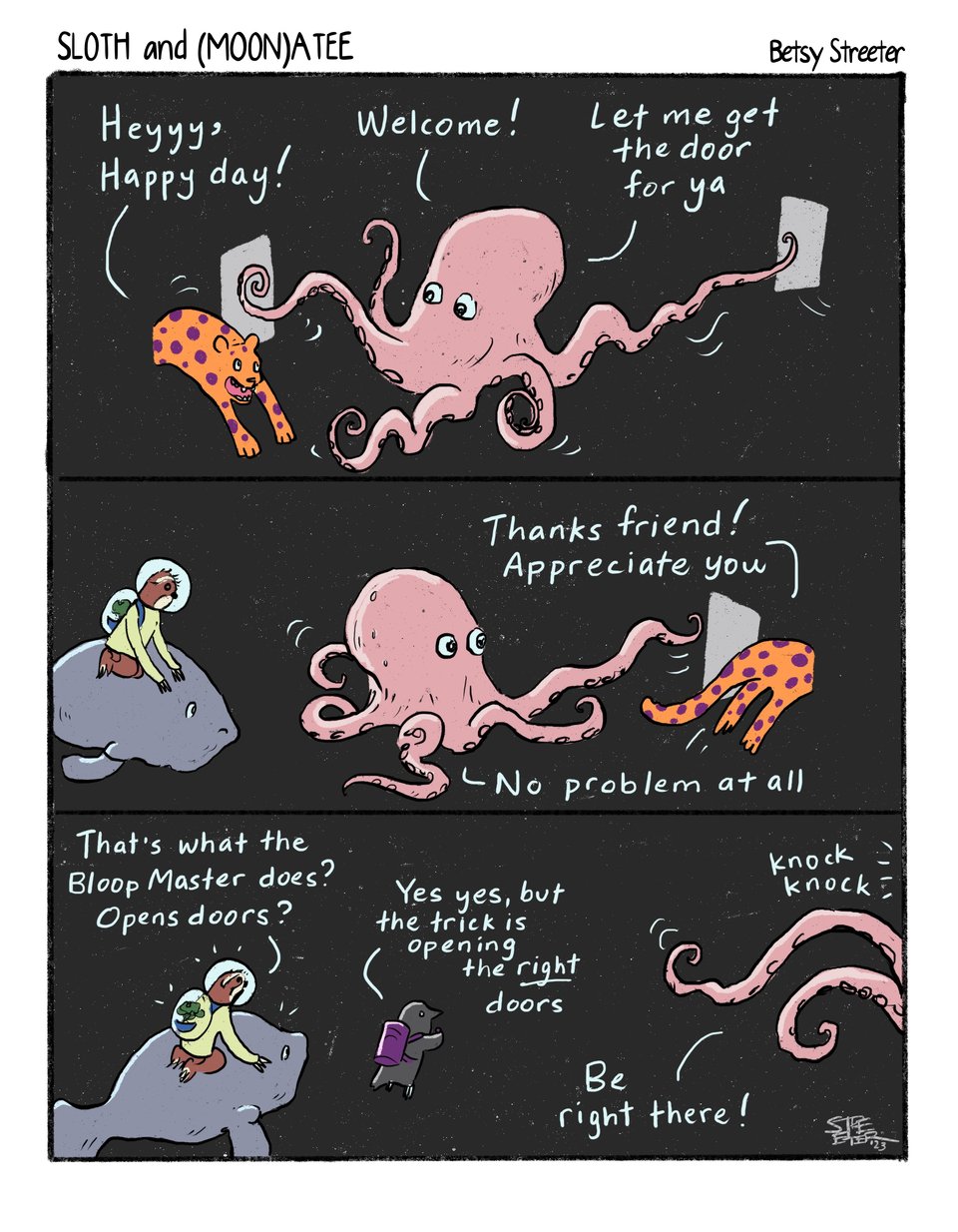 In Sloth and (Moon)atee, the friends encounter a penguin who introduces them to an octopus, who is the manager of the Interdimensional Bloop.