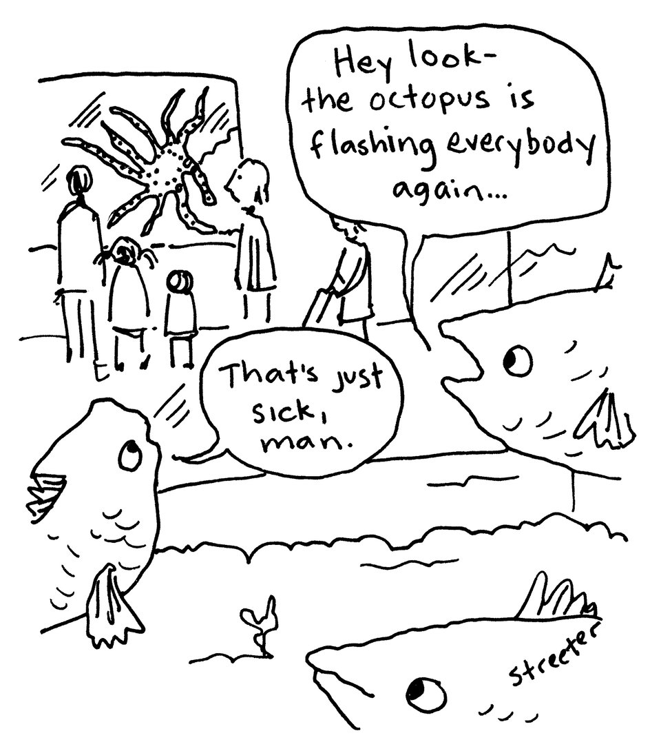 Here we are, all hung up on what we look like and sound like and putting up barriers all over the place, borders, prejudices, retail, fashion, political parties, sports teams, fences, little exoskeletons we zoom around in, levels of education, brand names, clubs, special lounges at the airport, and here’s the octopus, cruising around and becoming and re-becoming.